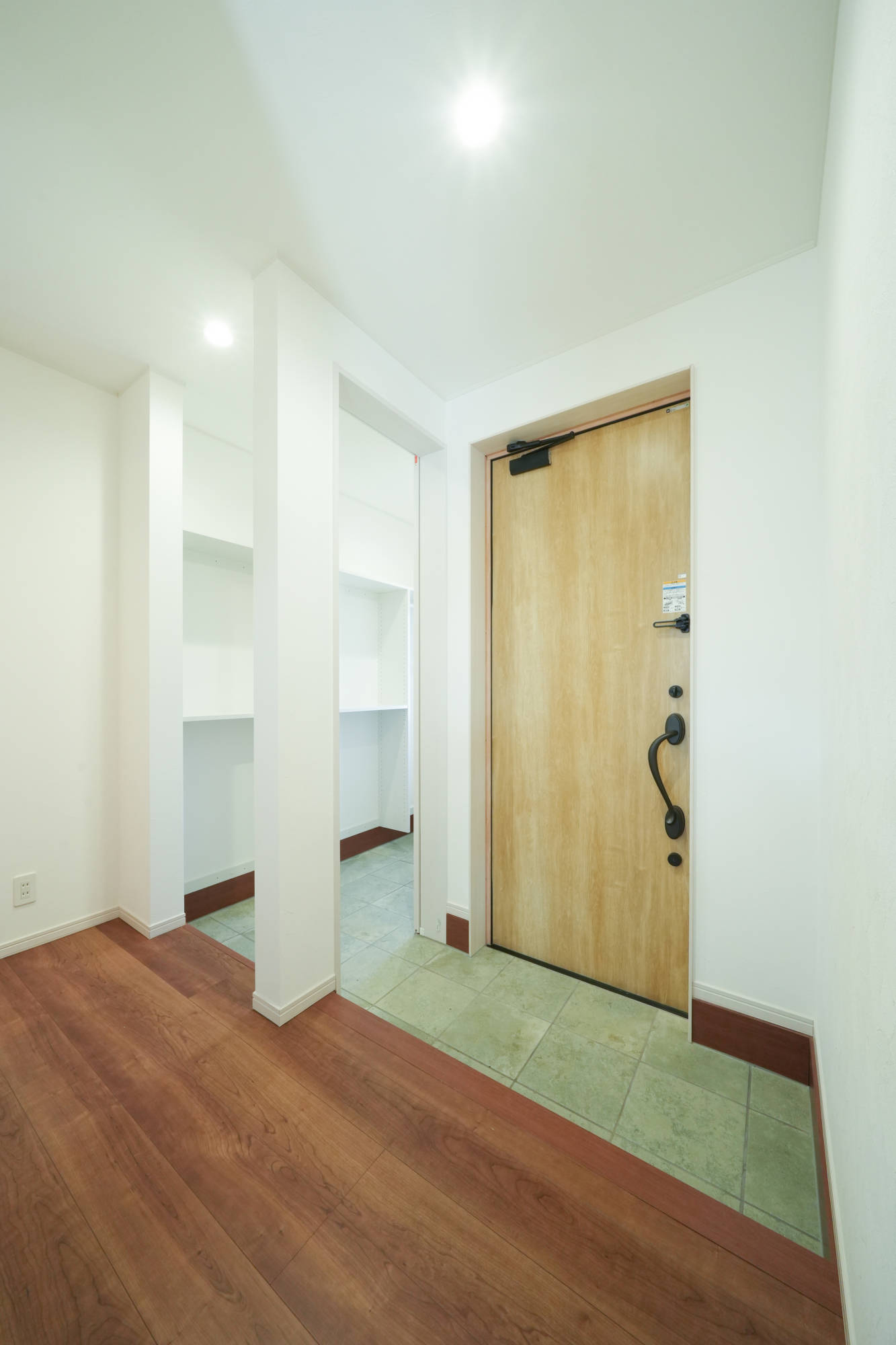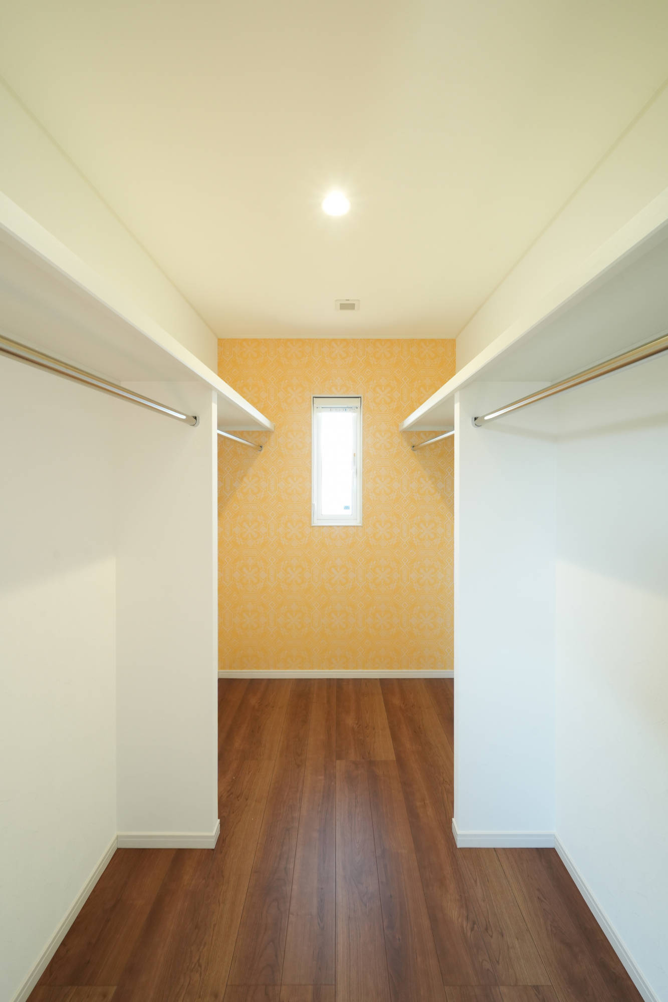 ウォークインクローゼットのアクセントクロスはオレンジ色です。