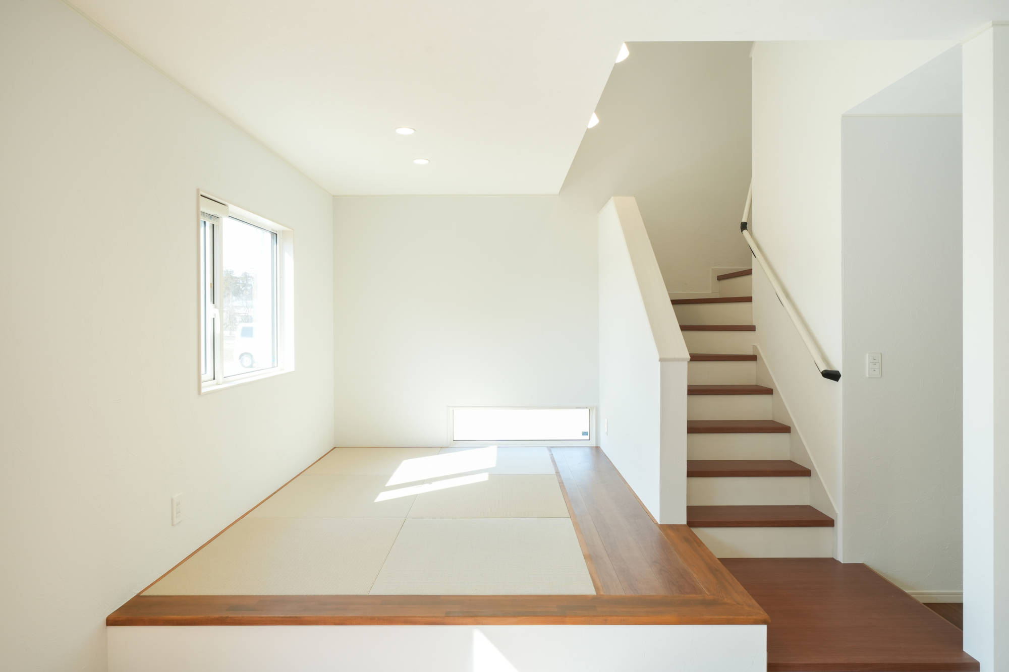 小上がりのタタミコーナー。人通りのある道路側の窓は床面に接した低い位置に設けました。