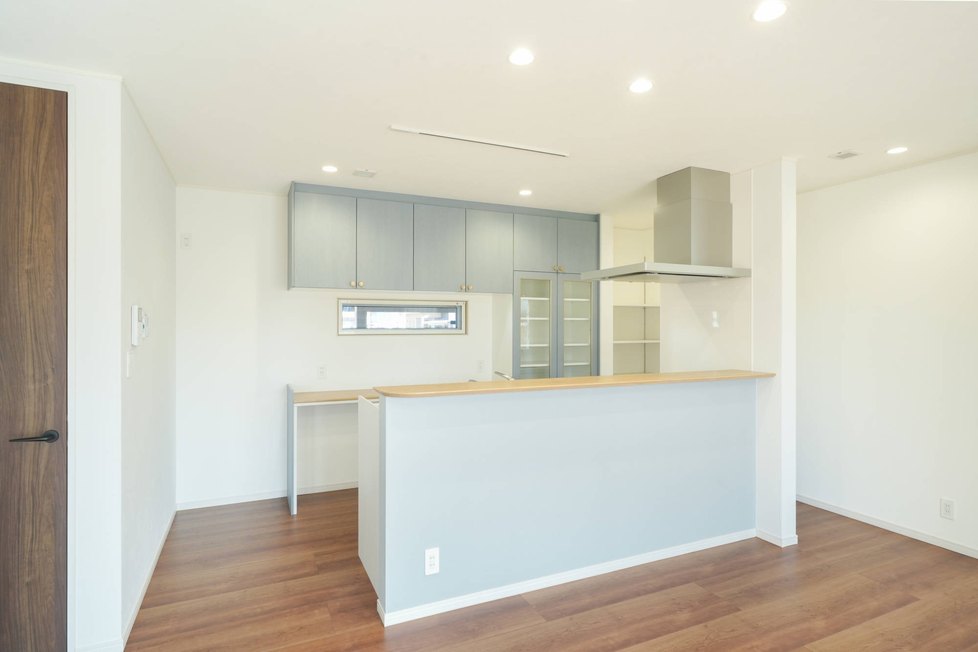 水色で統一したキッチン周りは爽やかで可愛らしい雰囲気になりました。