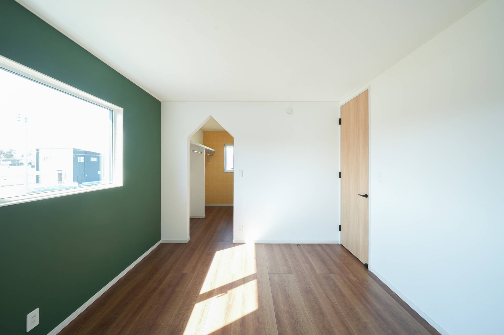 主寝室は森林のような深い緑色のアクセントクロスで落ち着く雰囲気があります。
