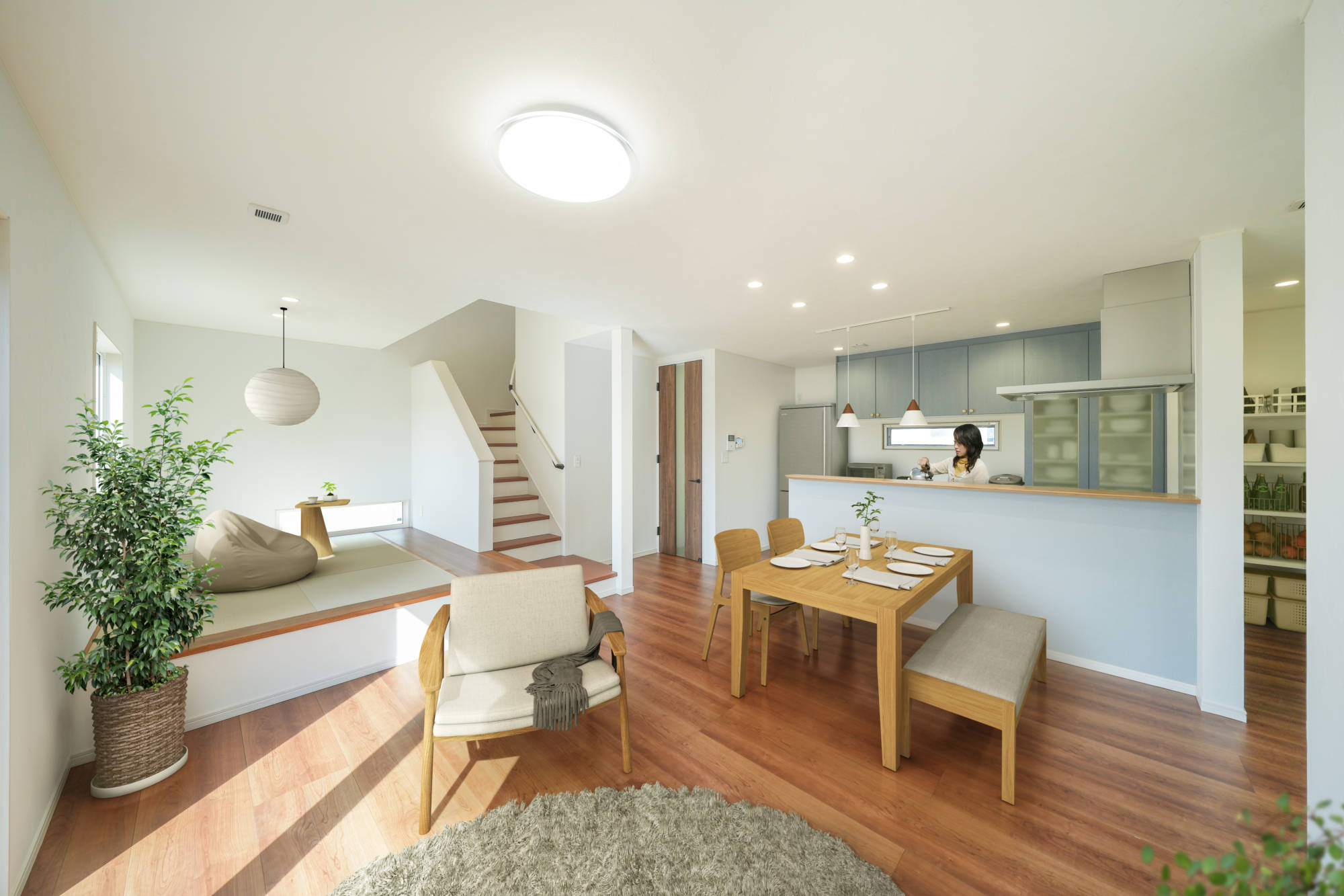 リビング、ダイニング、小上がりと家族がそれぞれの場所で寛げます。