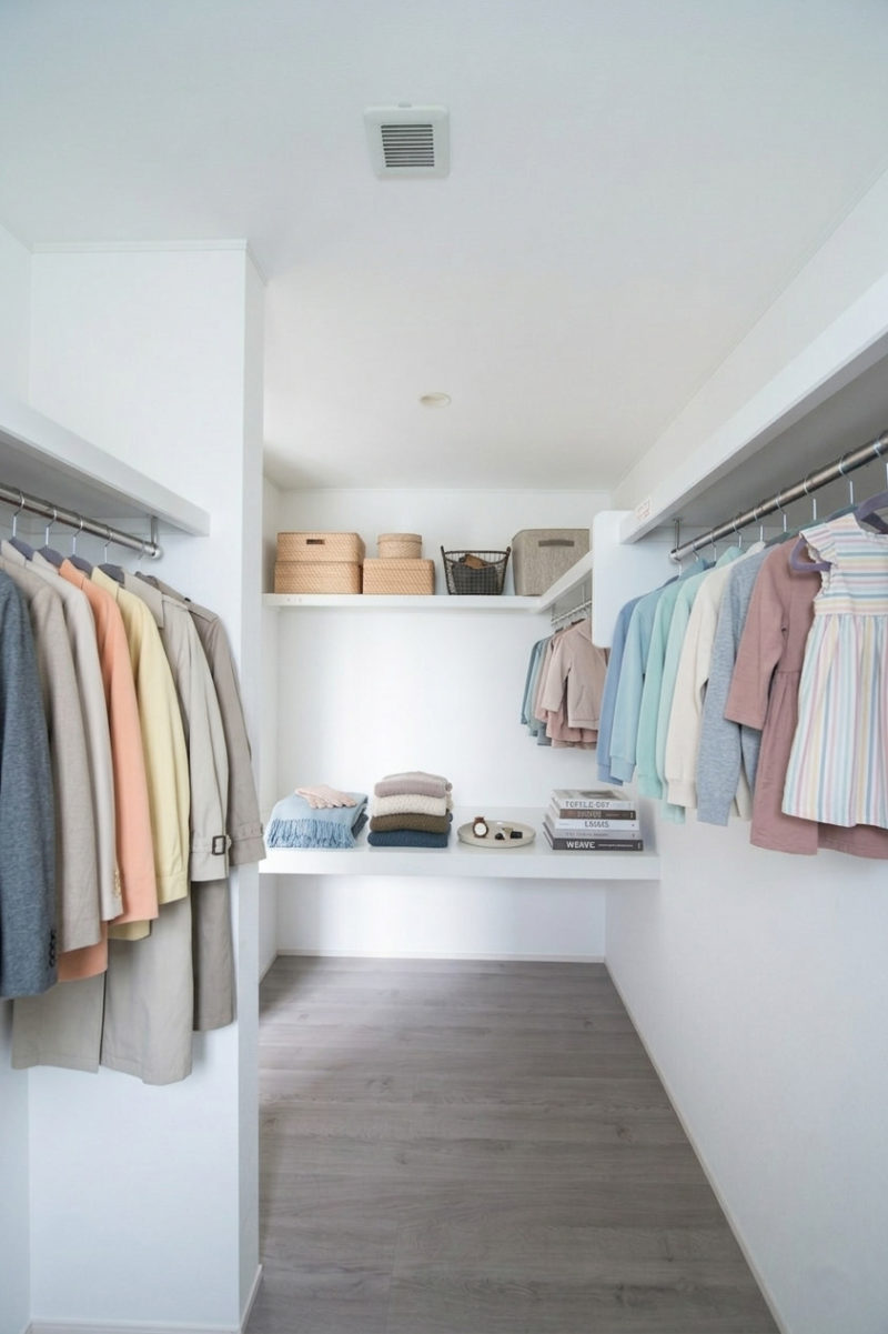 家族それぞれの衣類をまとめて収納できる大容量設計のウォークインクローゼット。
