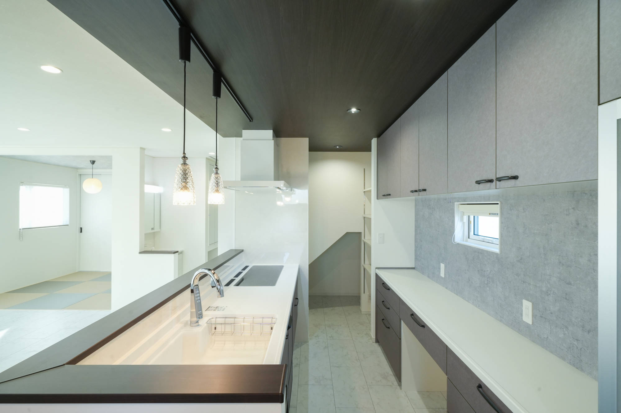 パントリーと階段下収納でキッチンが綺麗に片付きます。
