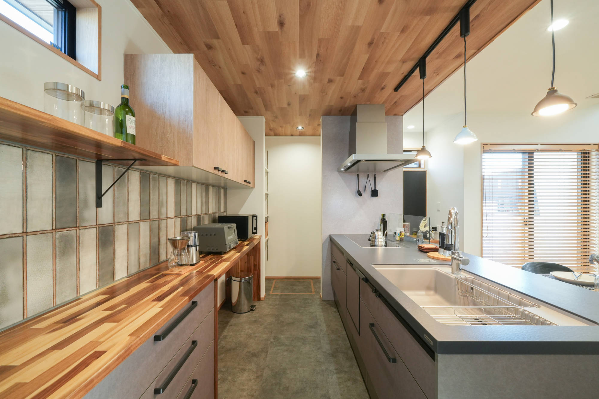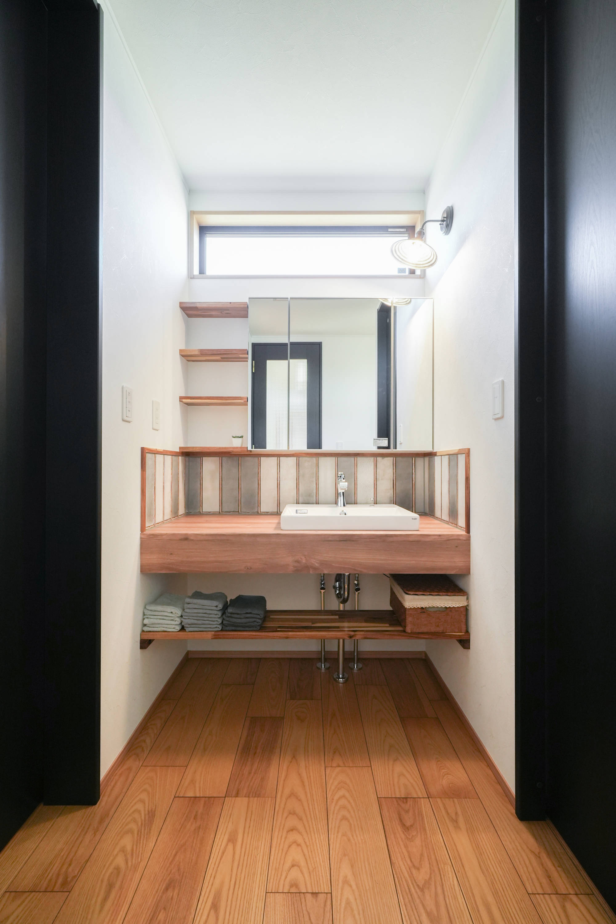 タイルと木の質感がおしゃれな洗面台。