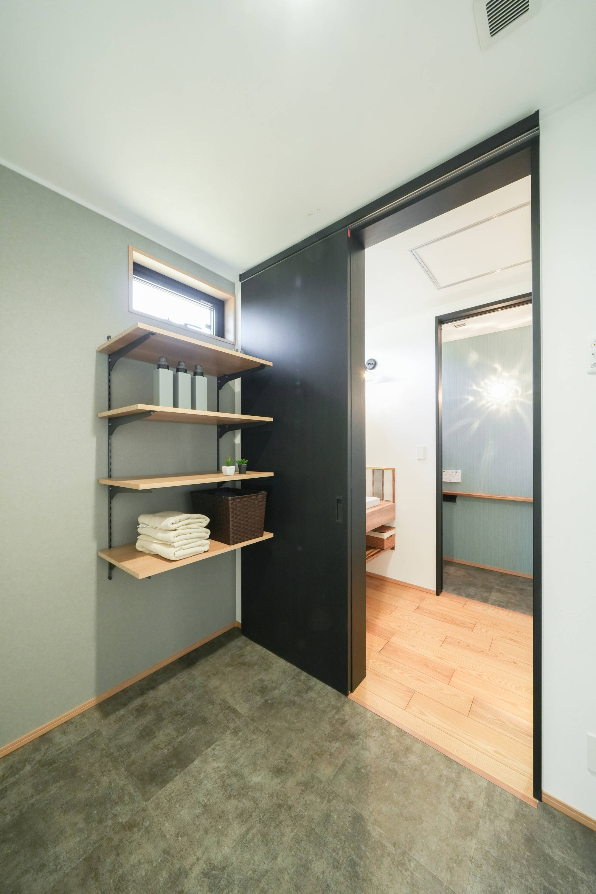脱衣室には収納棚を設けました。