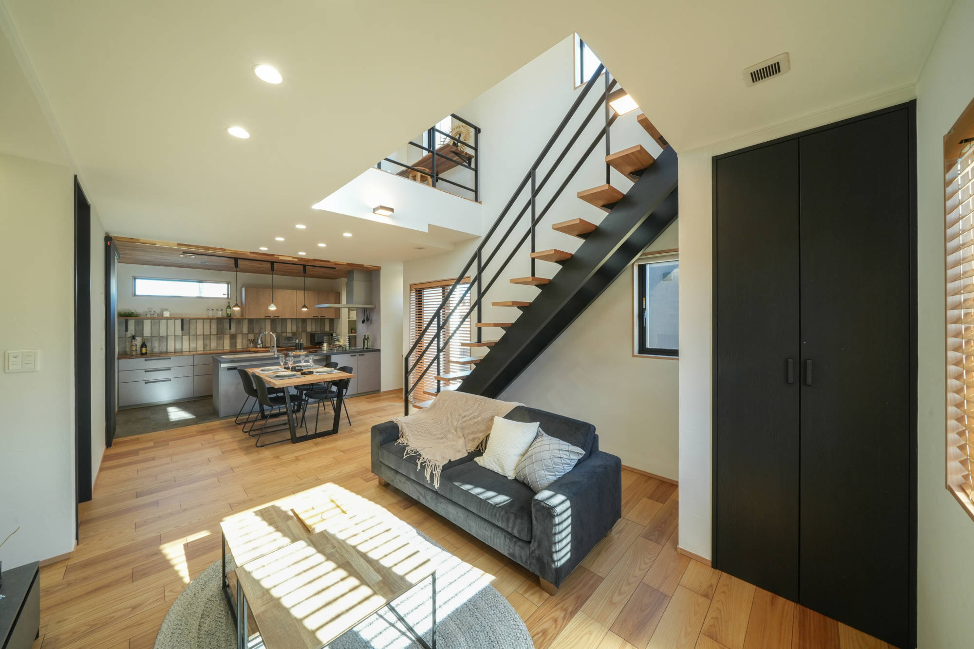 黒のアイアン階段の無骨さと木の温もりが調和した、ブルックリンスタイルのLDK。