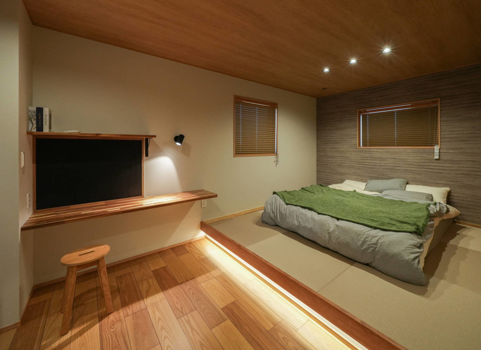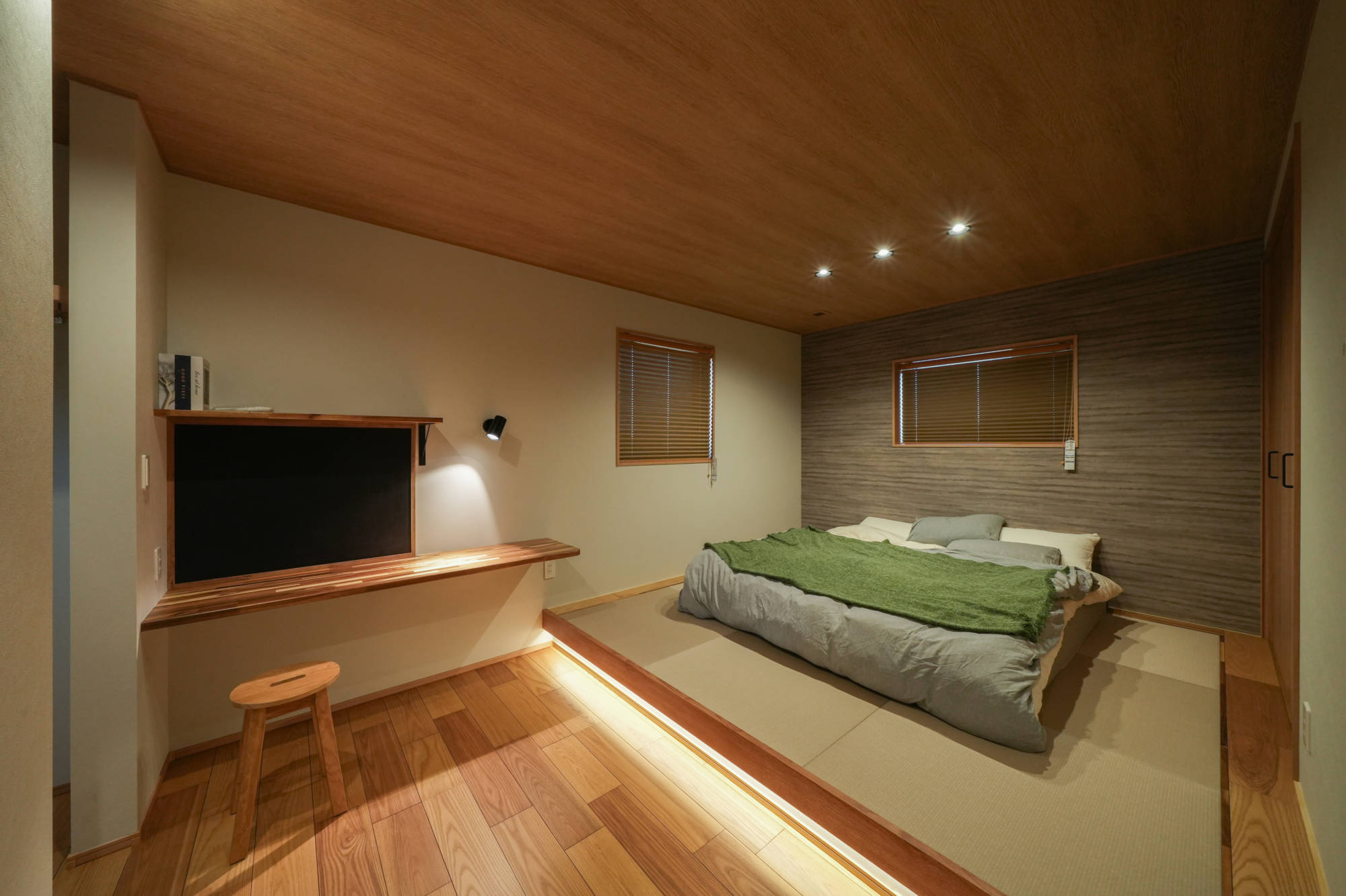 小上がりの畳が印象的で、旅館のような落ち着きを感じられる主寝室